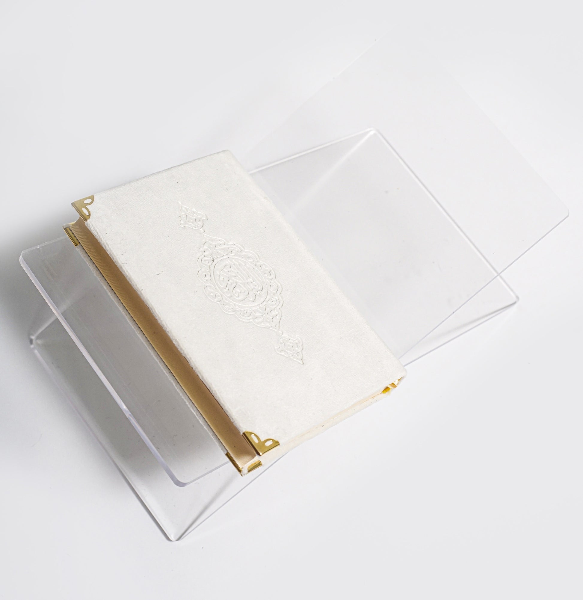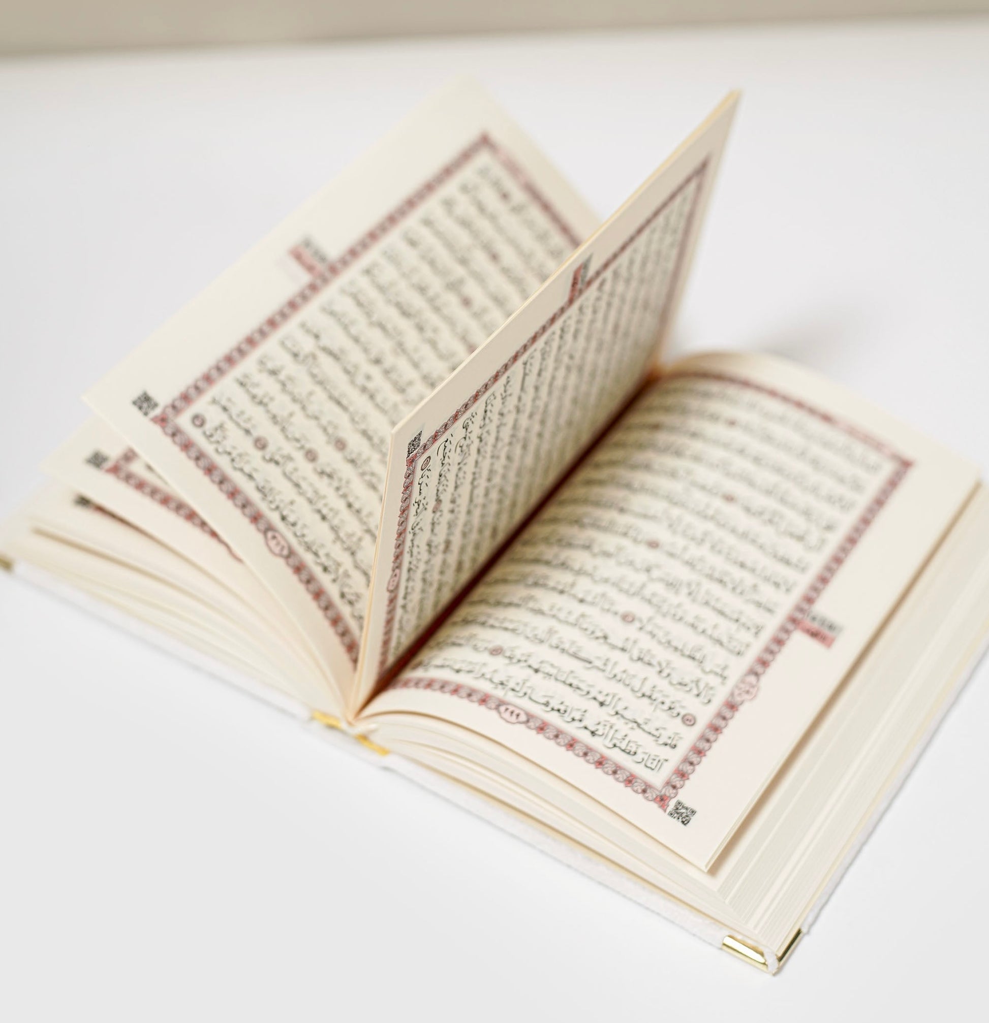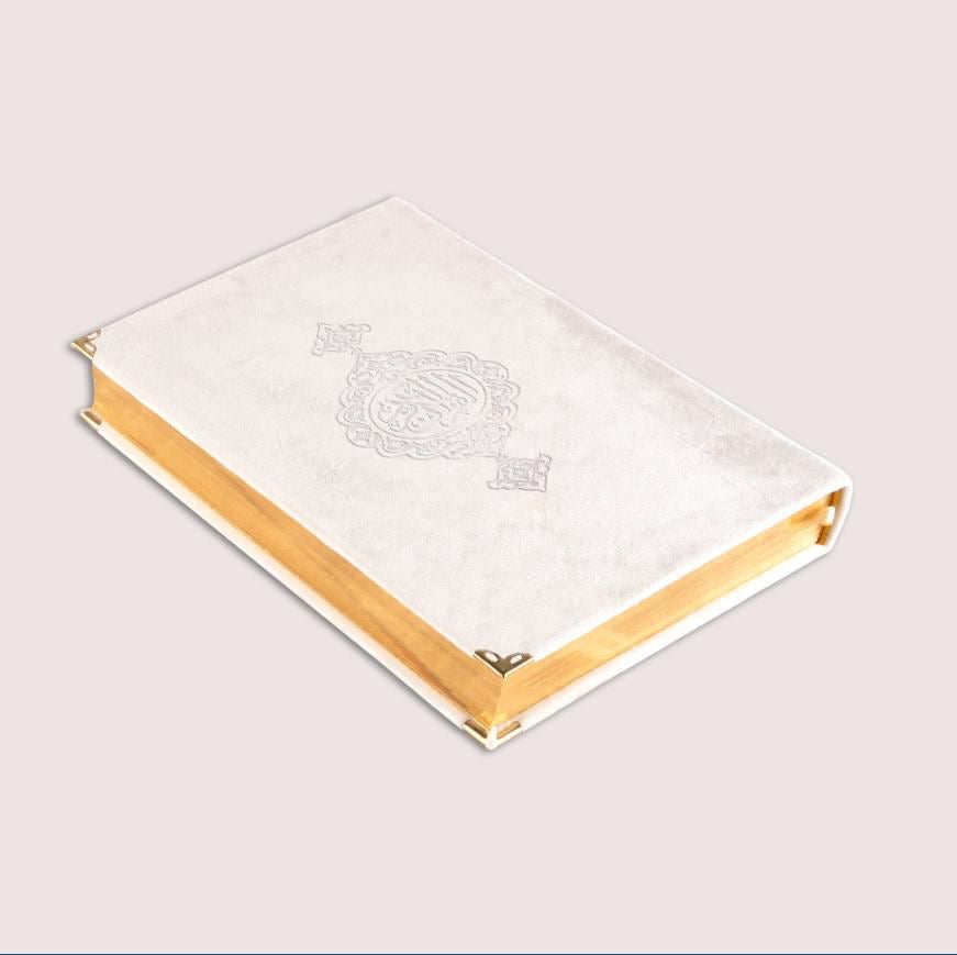 قرآن كريم كامل، مخمل فاخر، صفحاته مذهبة. اللغة العربية، خط حفص. المقاس المثالي: ١٧×١٢ سم.