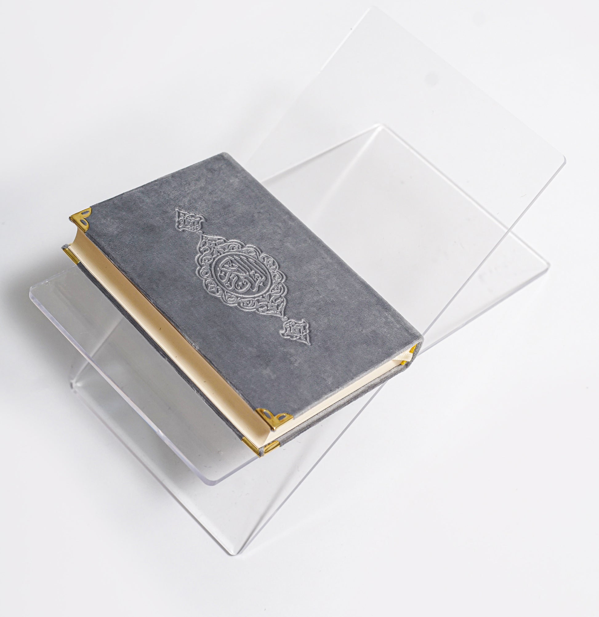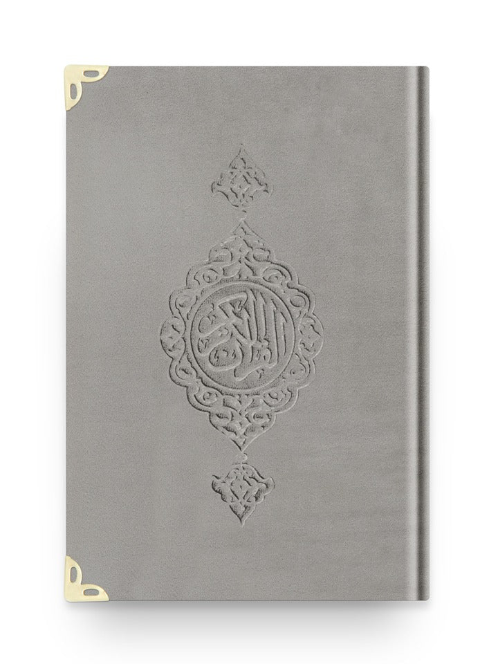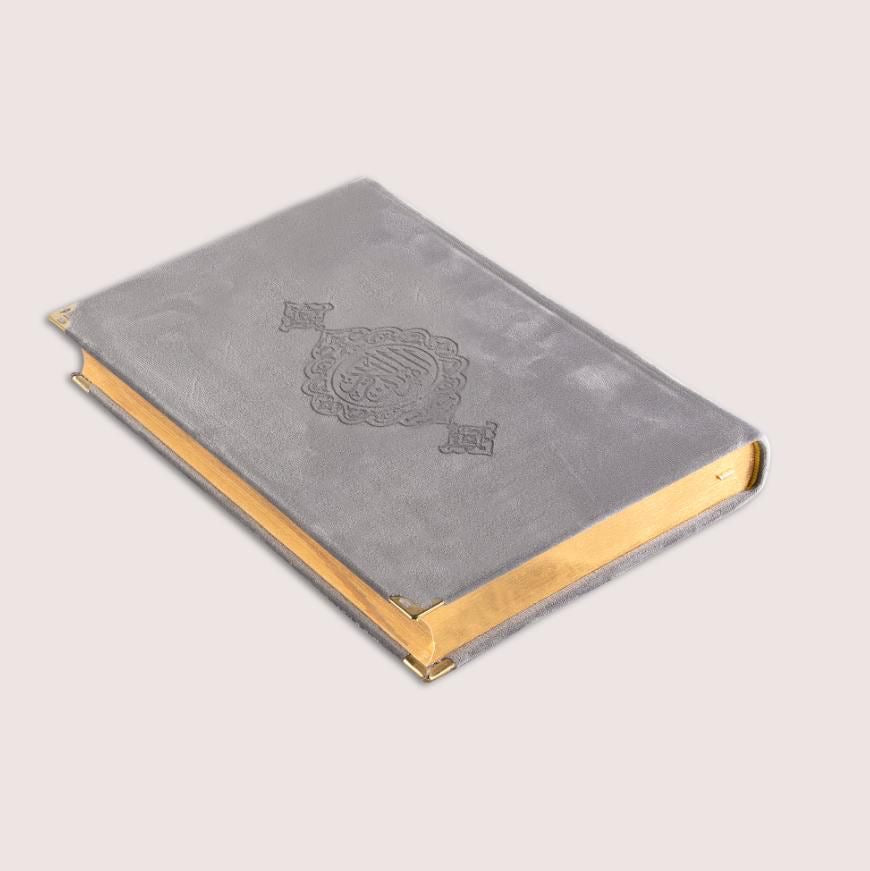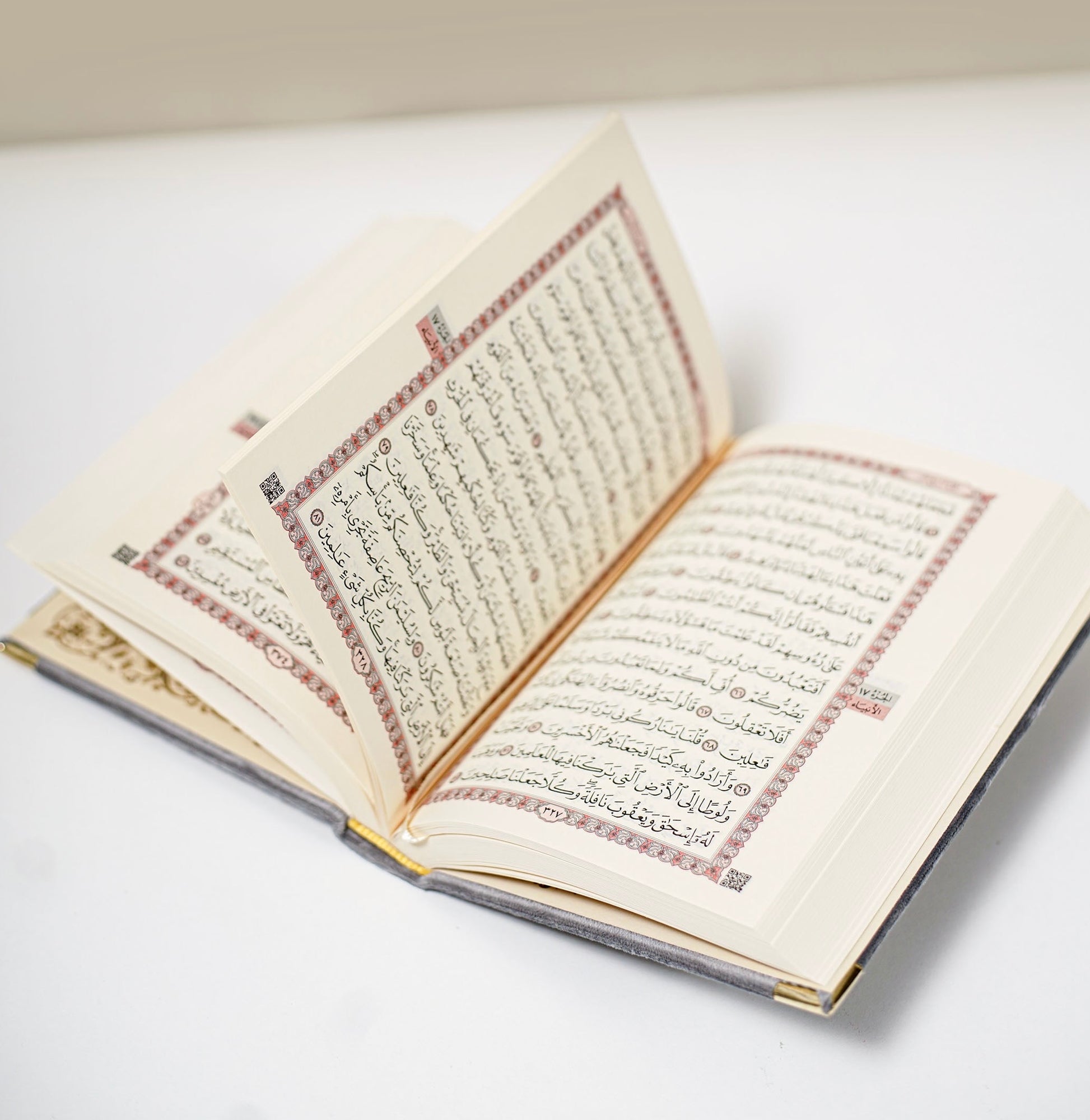 مصحف كامل من مخمل عالي الجودة، مزخرف بتذهيب في كل صفحة. مكتوب باللغة العربية برواية حفص، ويأتي بحجم مناسب ١٧×١٢ سم.