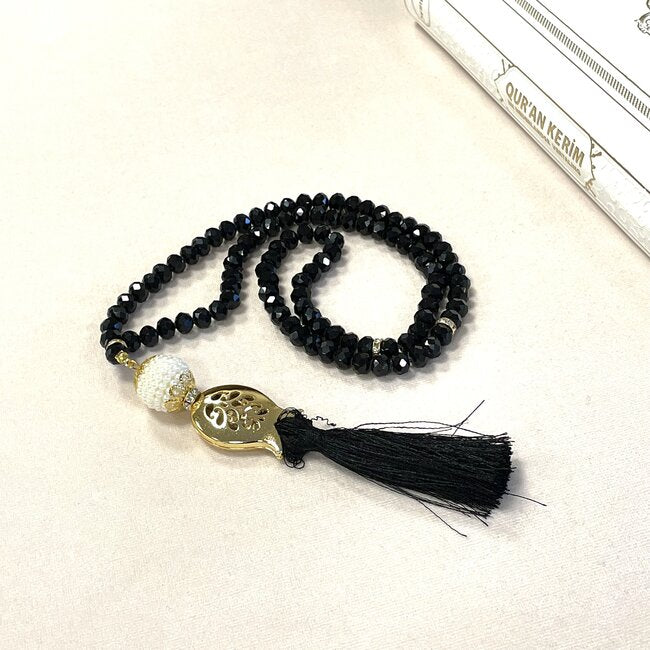 هذه المسبحة الكريستالية السوداء الفاخرة، المكونة من 99 حبة أنيقة، مثالية لمرافقة لحظات التأمل الخاصة بك.
