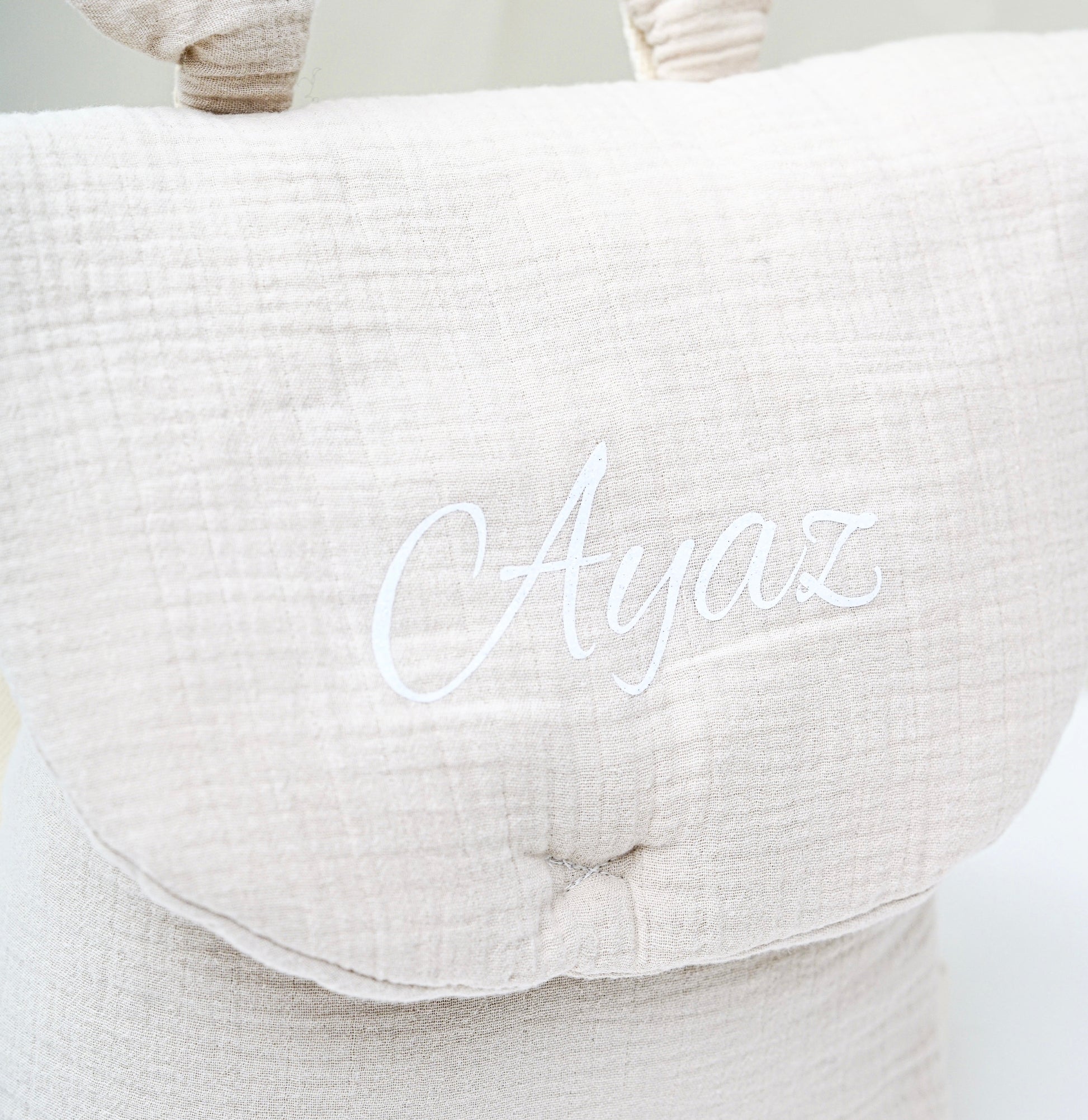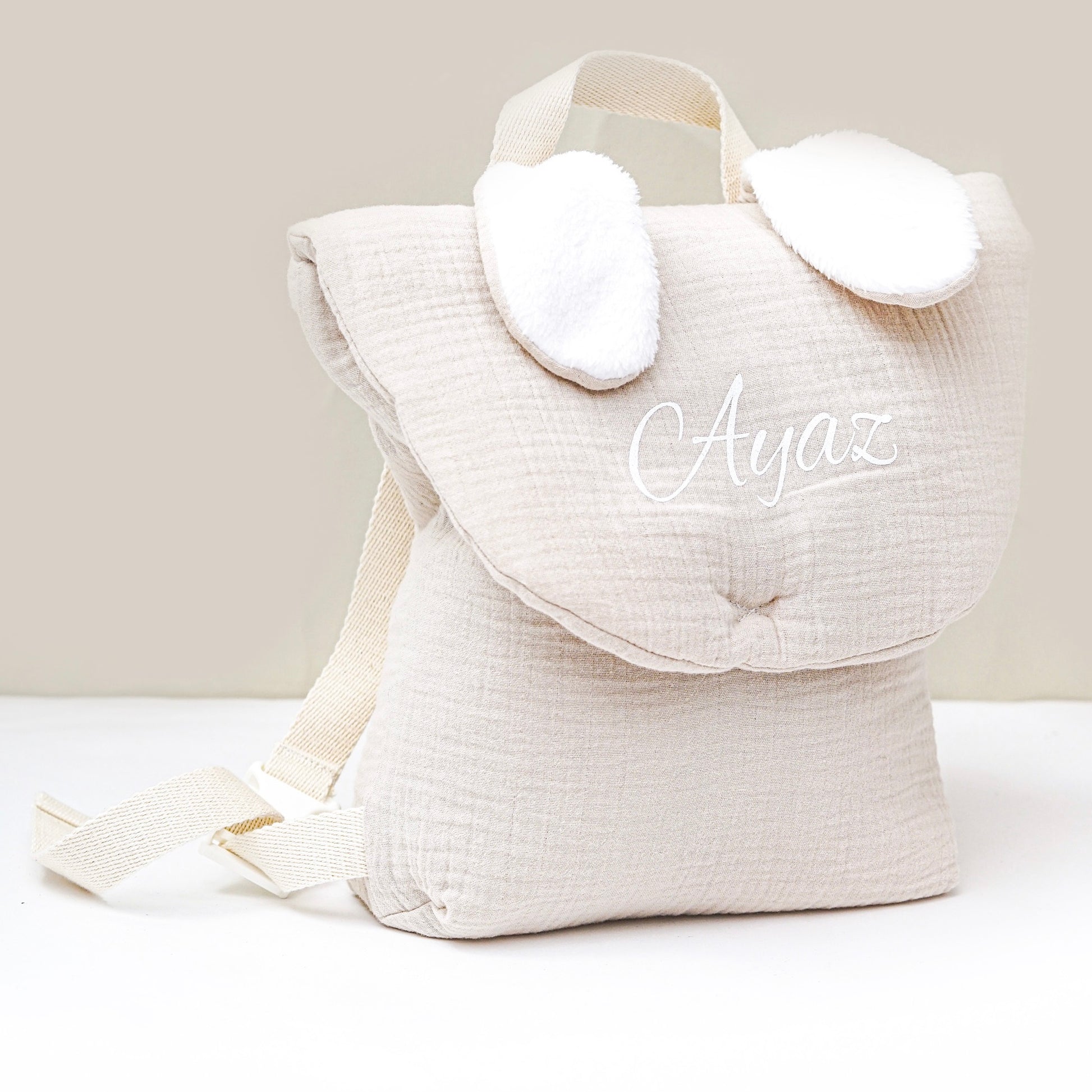 حقيبة الظهر هذه المصنوعة من قماش الشاش القطني البيج هي الهدية المثالية للأطفال! مصنوعة من مواد عالية الجودة، ويمكن تخصيصها بكلمة أو اسم، وتتميز بتصميم أرنب جميل بأذنين. امنح طفلك حقيبة ظهر عملية وجذابة.