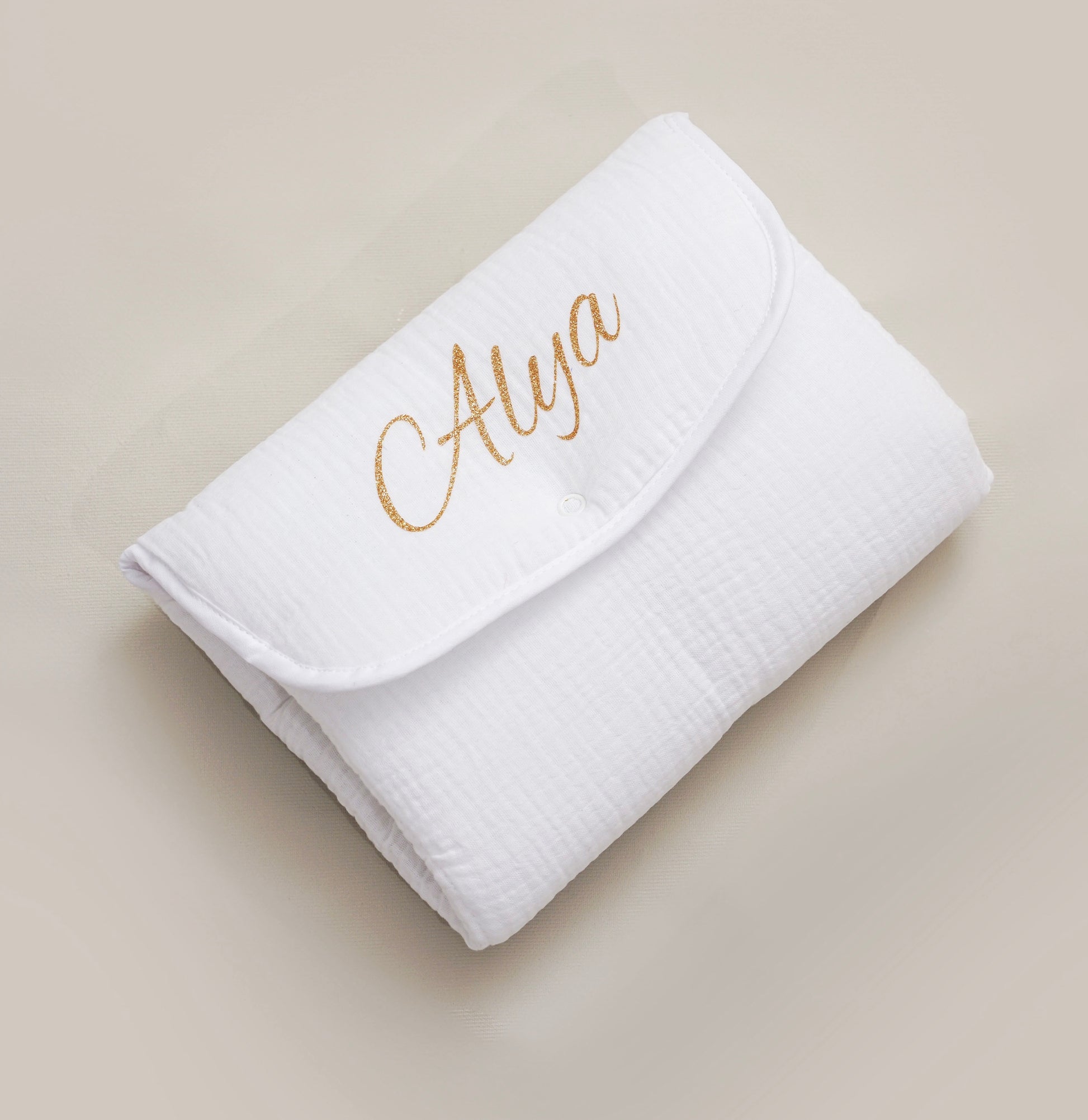 هدية مثالية لمولود جديد أو طفل رضيع أو طفل صغير. سجادة تغيير حفاضات مصنوعة من القطن والشاش المقاوم للماء، مصممة خصيصًا، بجودة فائقة. أضف لمسة شخصية عليها بكلمة واحدة.