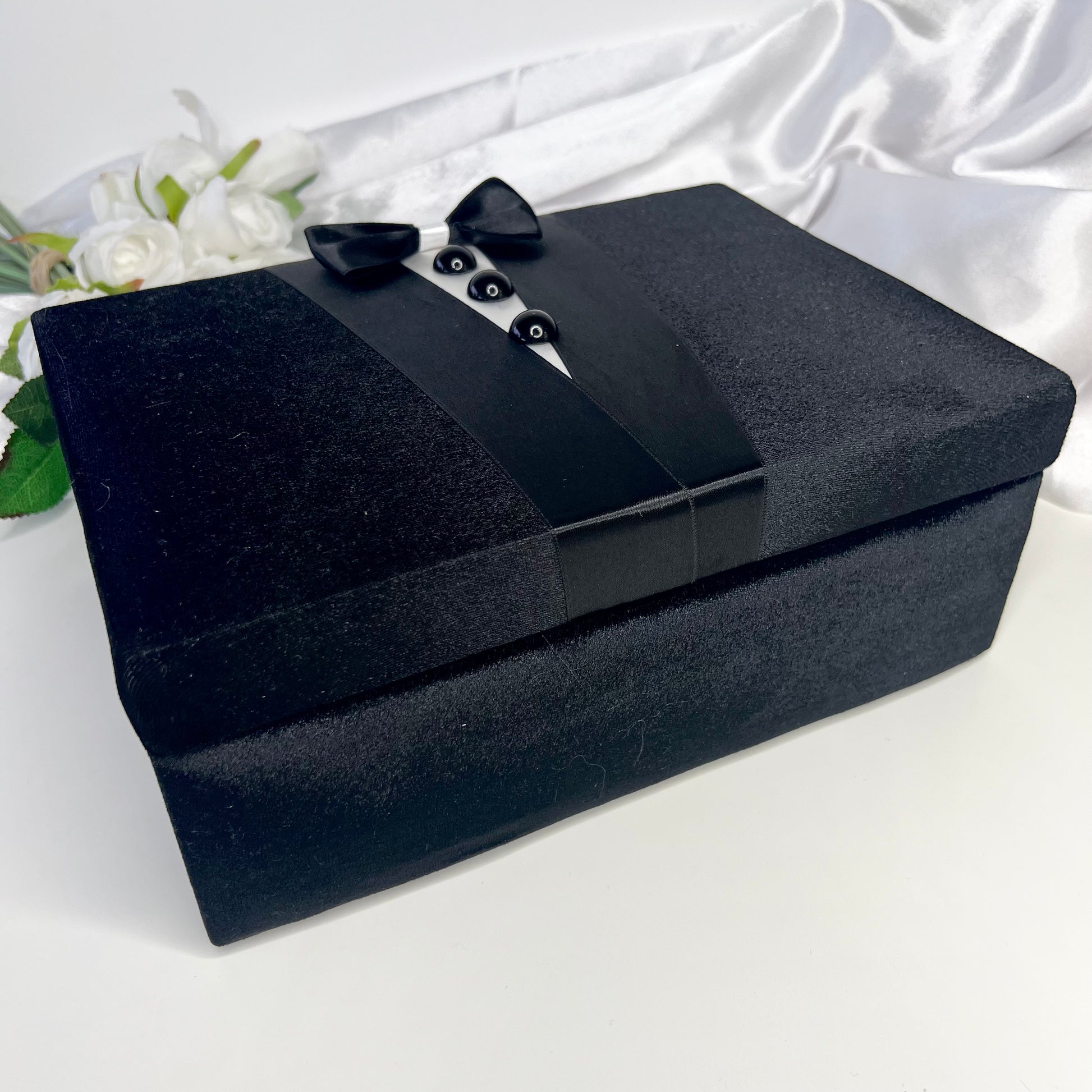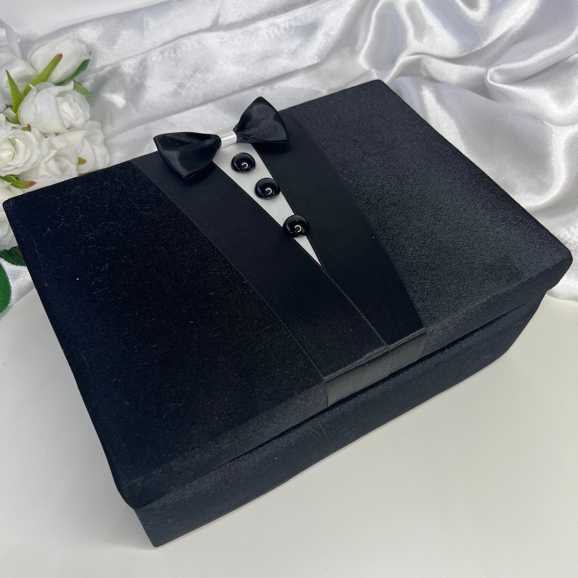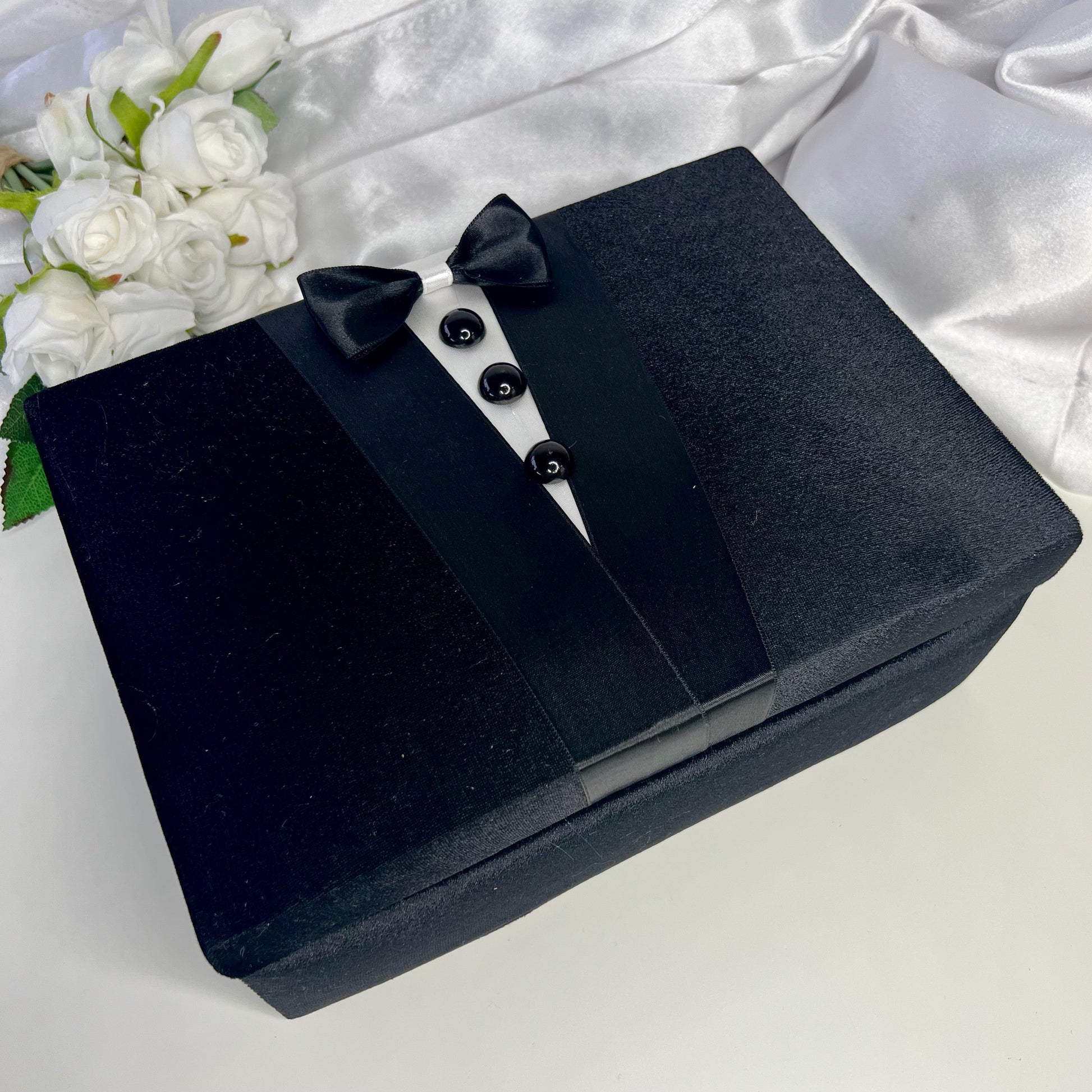 الصندوق متوفر بثلاثة ألوان: الأبيض أو البيج أو لون البدلة الرسمية للسيد.