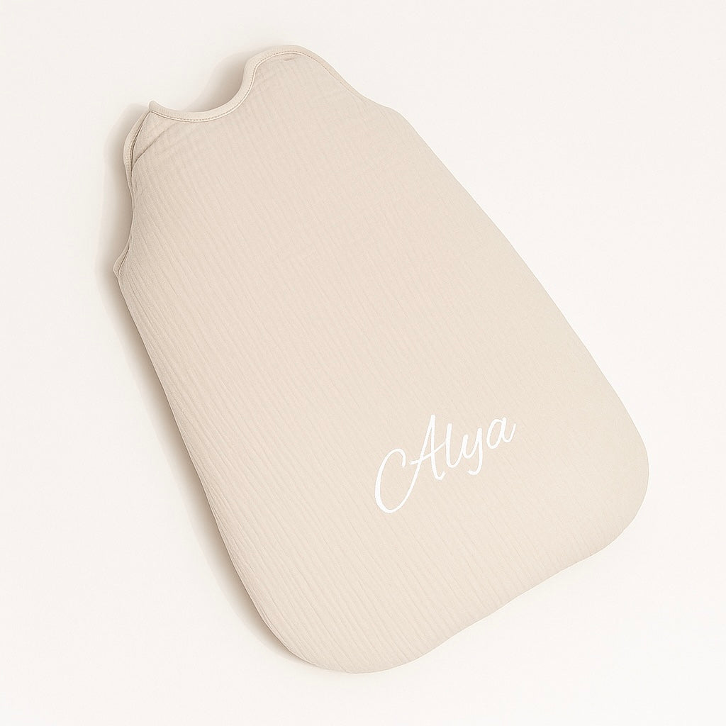 تضمن حقيبة النوم المصنوعة من الشاش القطني، والمخصصة بكلمة فريدة، لطفلك نومًا هادئًا وراحة مثالية.