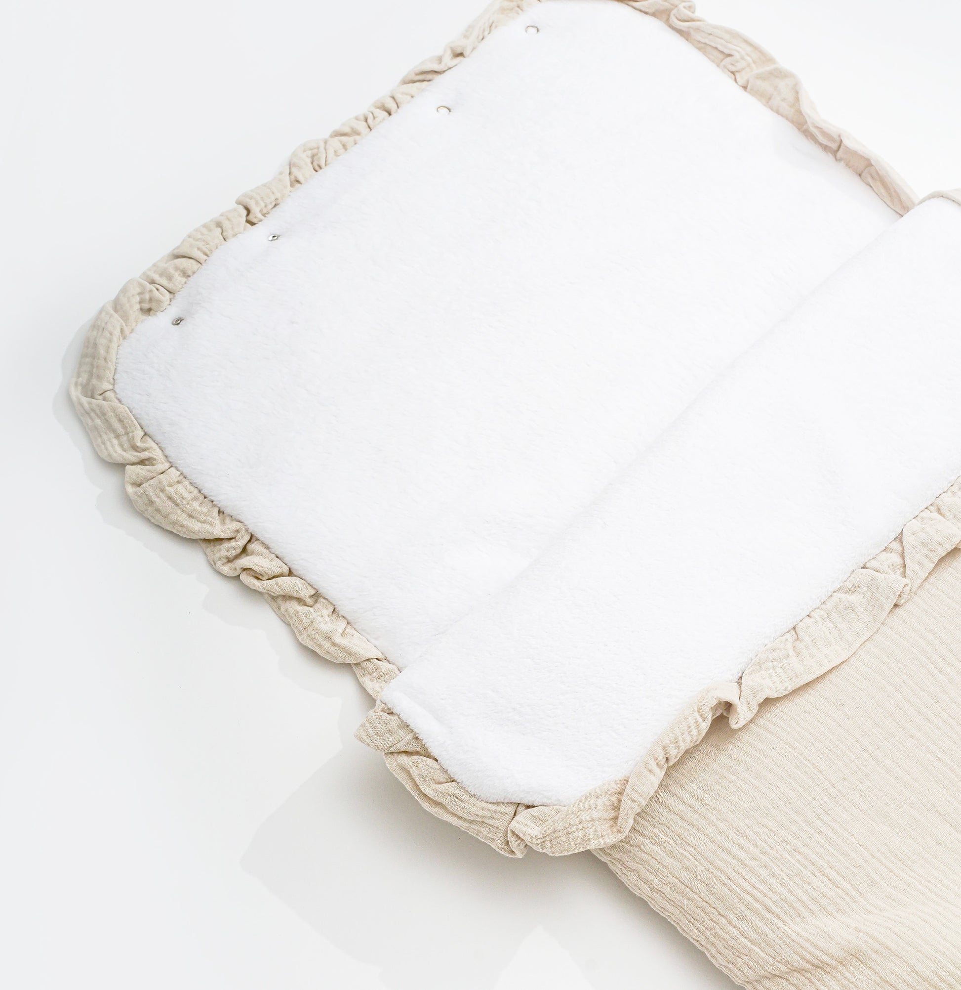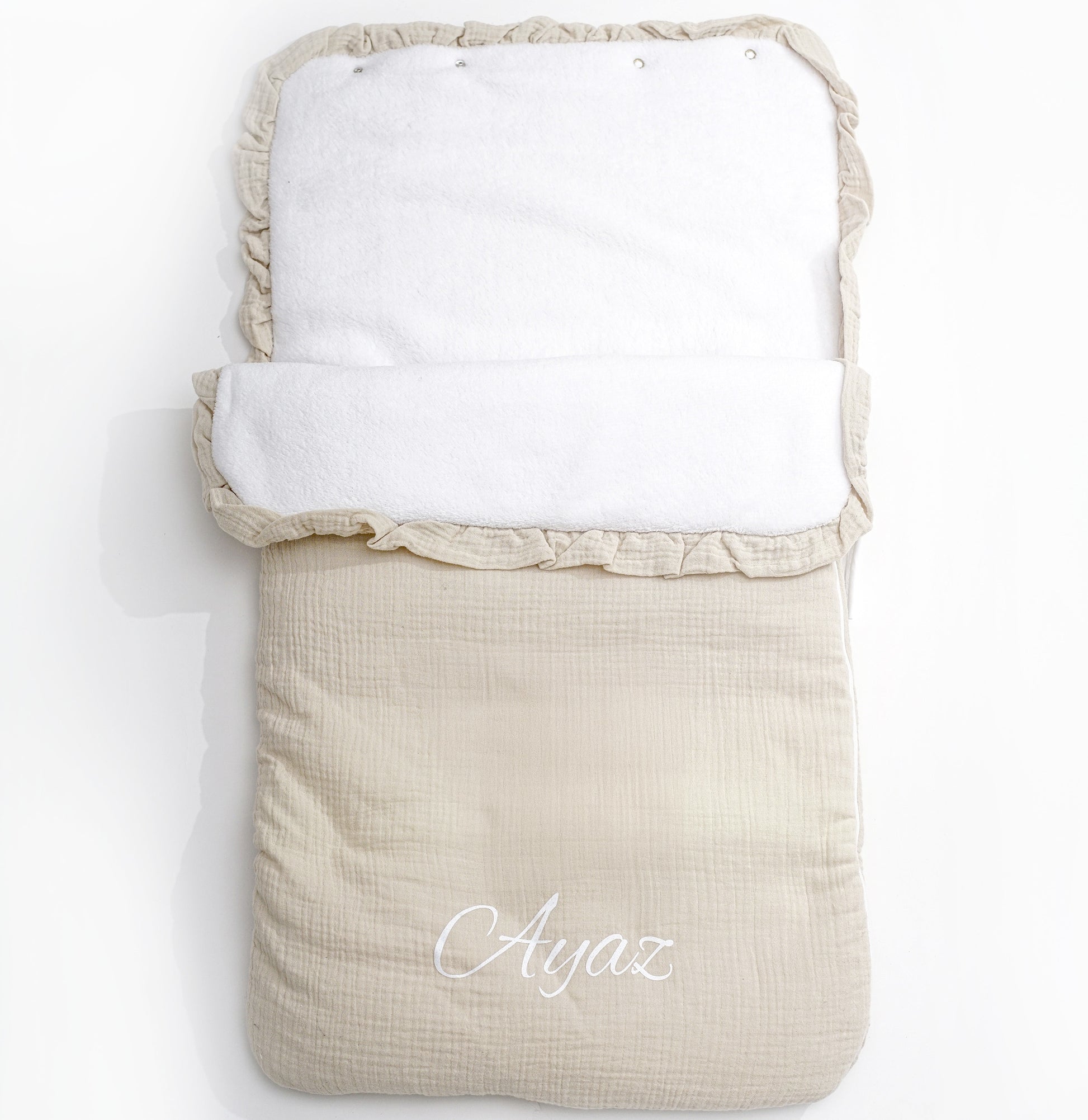 عش أطفال مُصمم خصيصًا من قماش قطني شاش، مثالي للأطفال من عمر يوم إلى 8 أشهر. ناعم جدًا ومُخملي للغاية، مثالي للحفاظ على دفء طفلك. عملي، مزود بملحقات لعربة الأطفال ومقعد السيارة في الخلف. أضف لمسة شخصية مميزة بكلمة واحدة. قطعة أساسية لراحة طفلك.