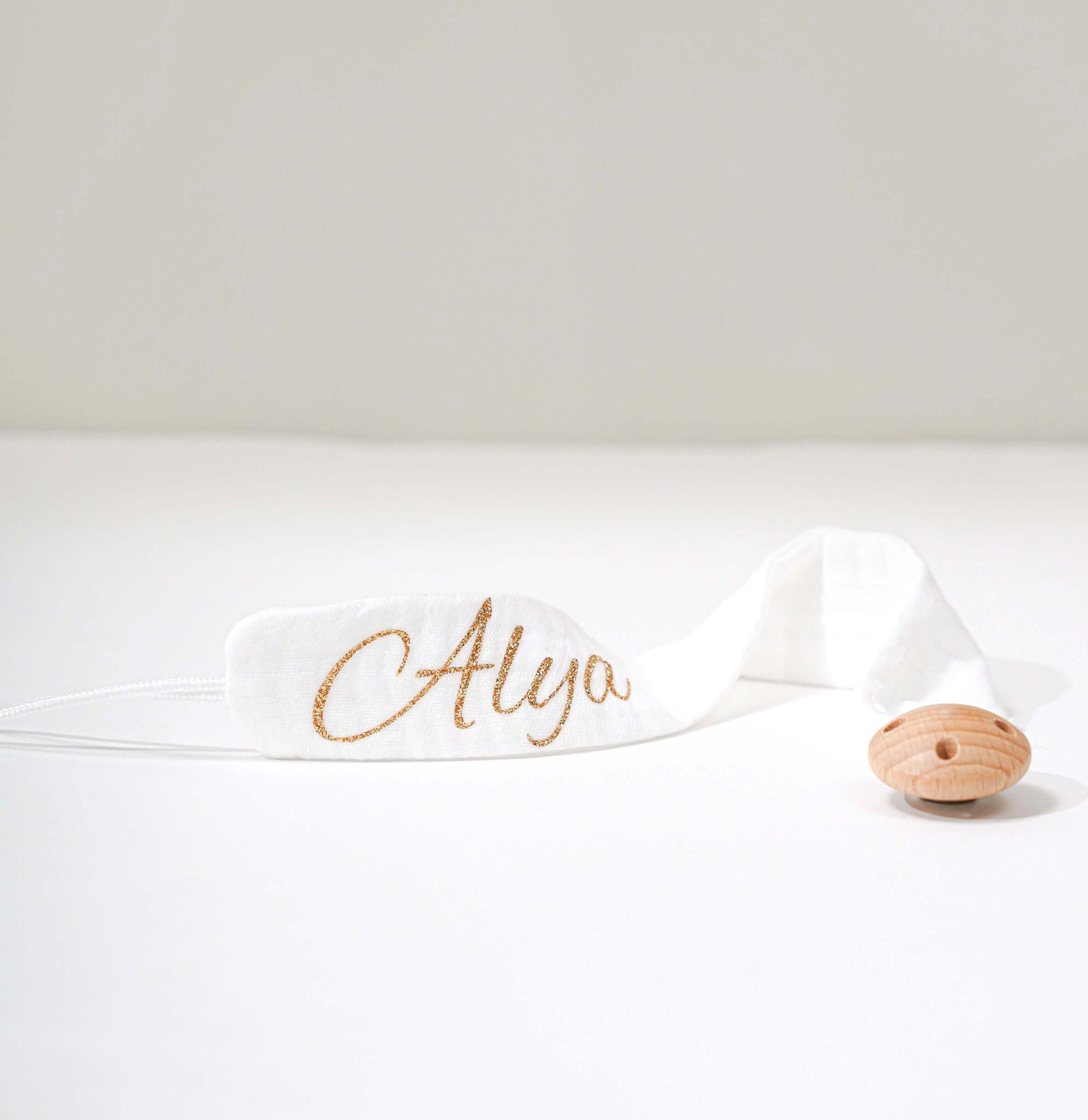 Sujeta fácilmente el chupete de tu bebé con este clip de gasa de algodón. Personalízalo para un regalo único y práctico.