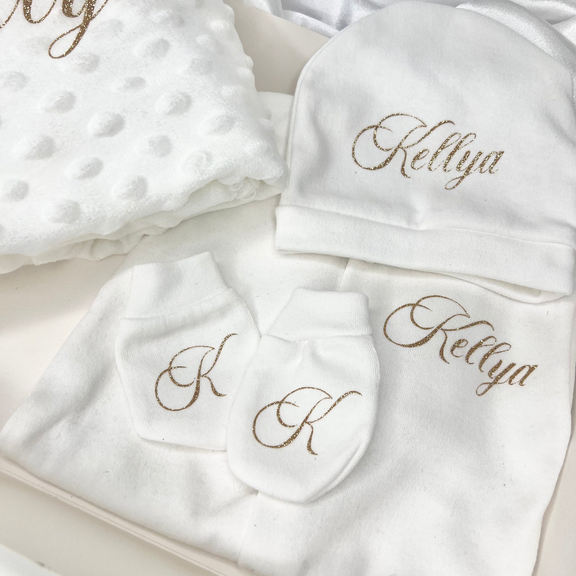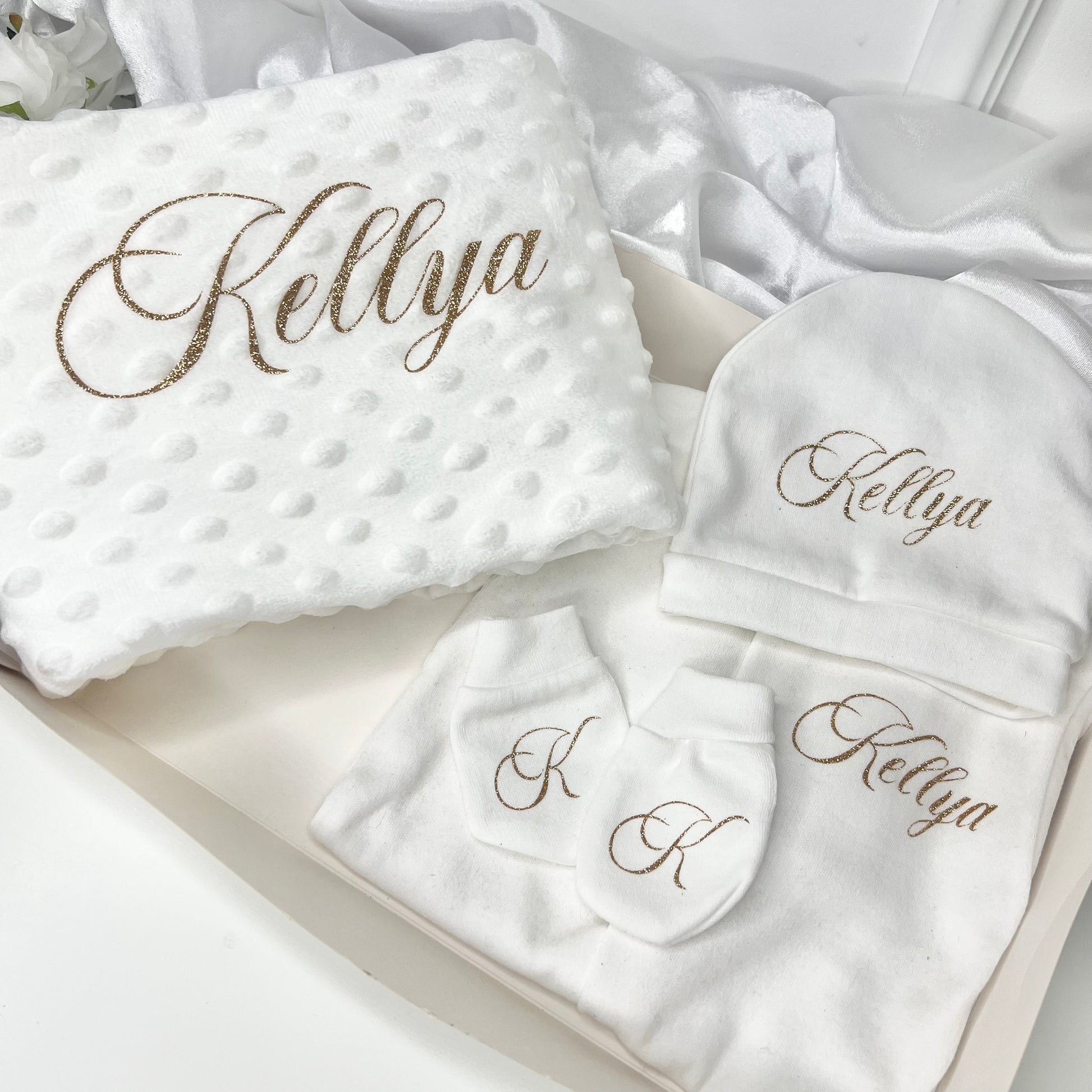 Dale a tu bebé todo lo que necesita con nuestra caja de bebé imprescindible 🍼. Incluye una manta, un pelele, un gorrito y guantes, todos de algodón y personalizados para un toque especial. Disponible en talla 0-3 meses, es el regalo perfecto para un baby shower de recién nacido.