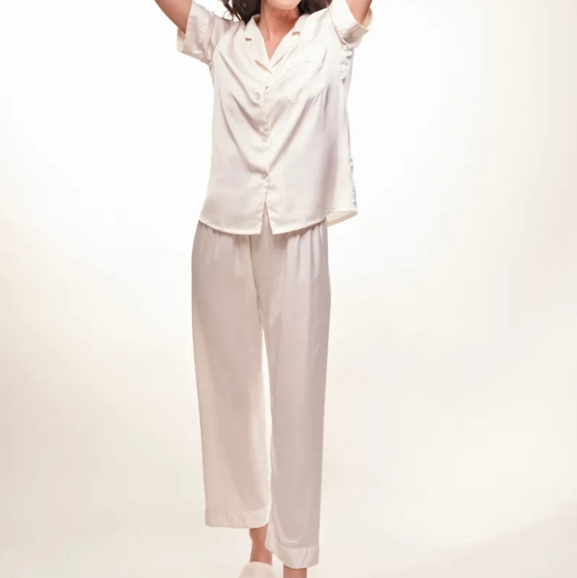 Ontdek absoluut comfort met deze witte pyjamaset, ontworpen om je welzijn en zachtheid te bieden. De bijpassende broek garandeert een harmonieuze outfit, ideaal voor rustige en verkwikkende nachten.