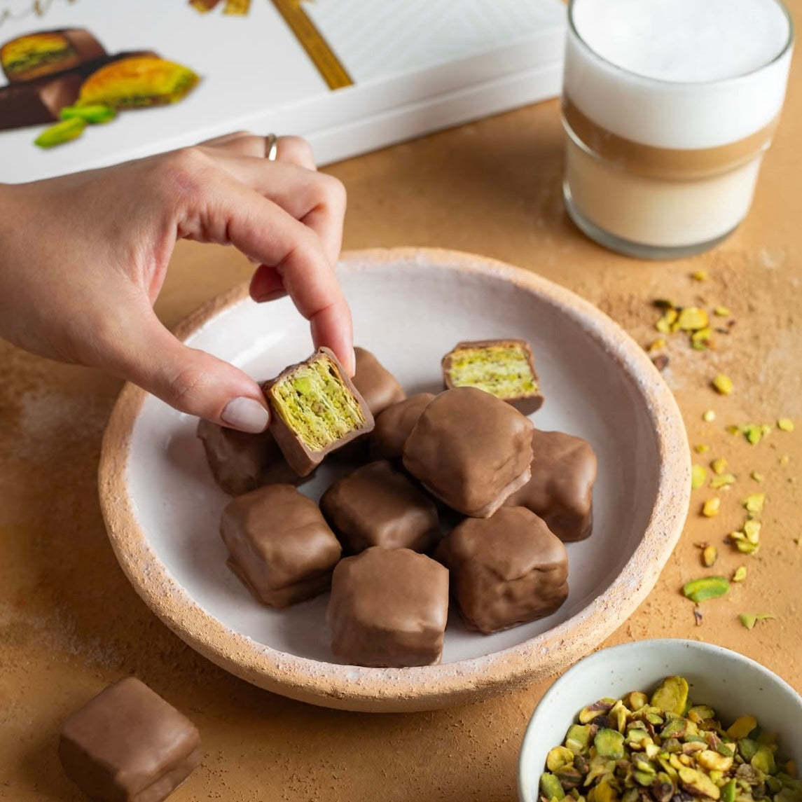 Descubra a doce delícia destas baklavas cobertas de chocolate, vindas diretamente da Turquia e cuidadosamente preparadas com pistácios de Gaziantep, mundialmente famosos. Presenteie-se a si ou a alguém especial com esta delícia que certamente irá encantar o seu paladar.