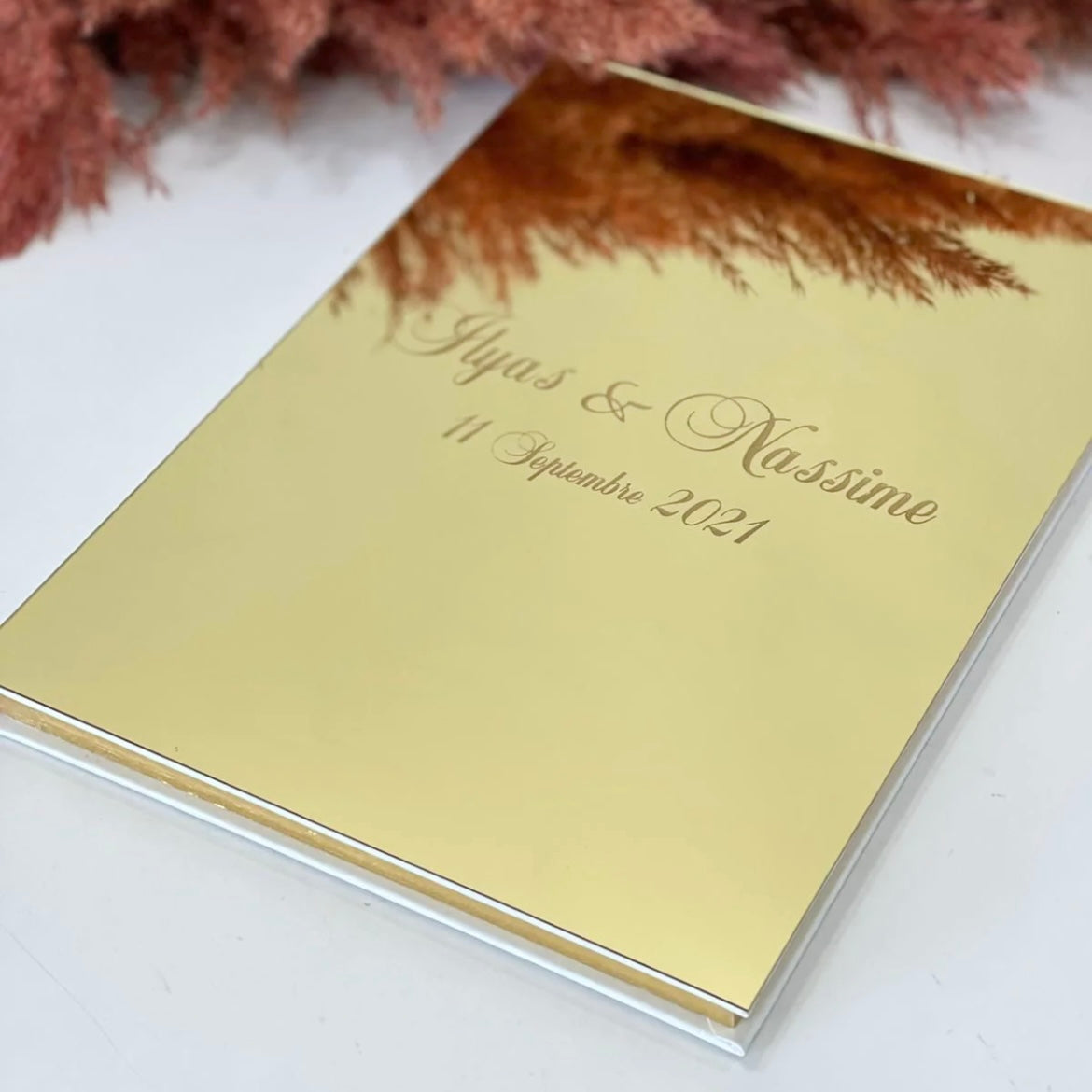 Livro de visitas personalizado em Plexiglas com efeito espelho.
