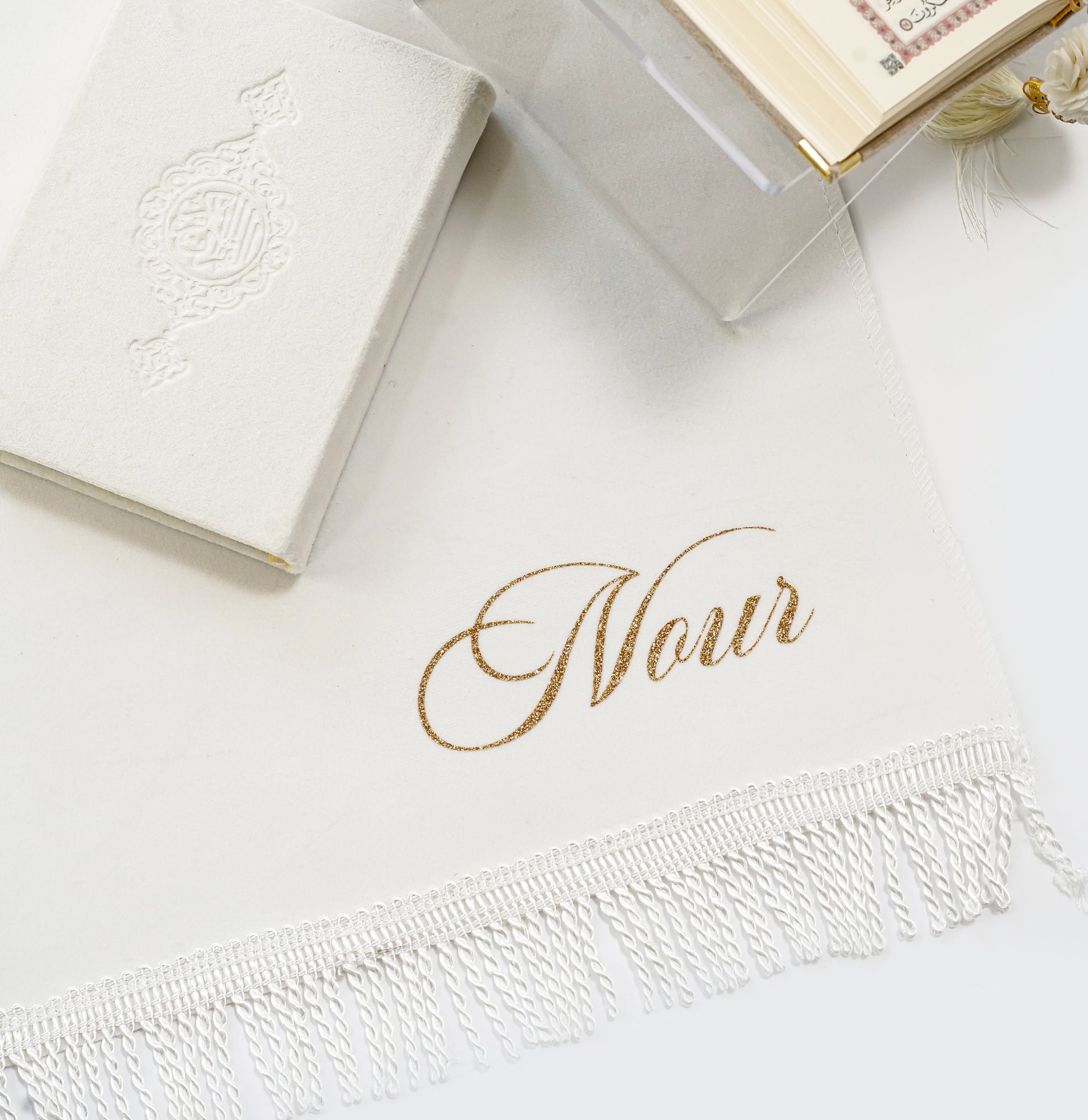 Bu ince beyaz seccade, huzurlu bir tefekkür anı için zarafet ve yumuşaklığı bir araya getiriyor. Zevkinize göre özelleştirilebilen bu seccade, zarif bir dokunuş katan zarif, kıvrımlı saçaklarıyla öne çıkıyor. Ultra yumuşak dokusu, meditasyon veya dua anlarınıza huzurla eşlik etmek için ideal olan optimum konfor sunuyor.